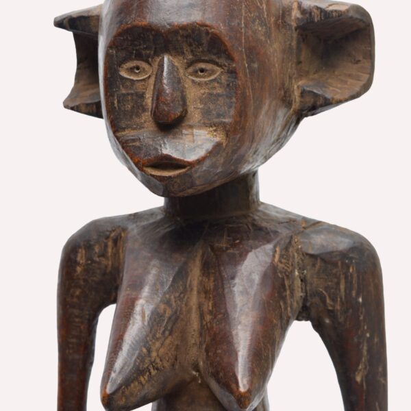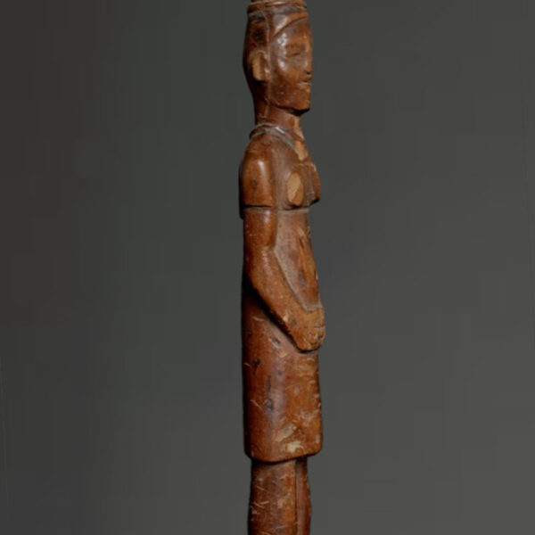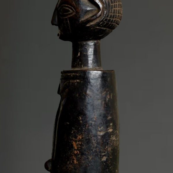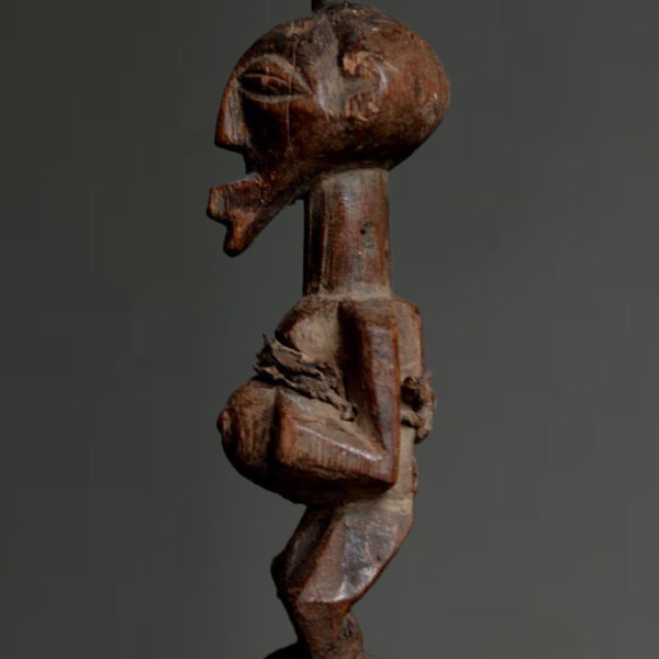 In Pende tribe , Democratic Republic of Congo, a protective post is carved with a representation of a maternity scene. The ancestral, matrilineal mother is depicted standing with her feet blending into the base and holding her child with her left hand while placing her right hand on her hip. The sculpture is made of wood and natural polychrome pigments in red, white, and black. These types of poles, called maternity poles, are believed to promote fertility among women in the village and are kept in the chief’s hut.